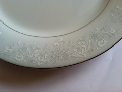 Complete set (for 8) of Fine China Dinnerware and Flatware. China Pearl design subtle white and gray on off-white china with silver rims and accent lines. Mint condition set includes dinner plates, bowls, dessert plates, cups and saucers, cream and sugar, large serving bowl, large serving platter, complete stainless steel flatware. TBD